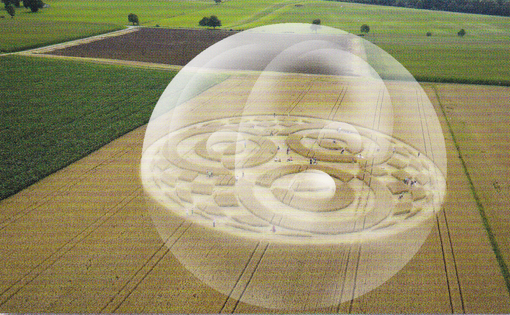 Ich spüre auch, dass IM Erdreich ebenfalls eine energetische Halbkugel wahrnehmbar ist. Der Kornkreis ist also die materiell sichtbare Form, die sich zwischen zwei Halbkugeln befindet, oder besser gesagt: die Mitte einer energetischen Lichtkugel. Im Zentrum der Lichtkugel, also auf dem Boden des Ackers, in der Mitte des sichtbaren Kornkreises, existiert ein energiegeladenes Zentrum, aus dem eine Kraft in die den Kornkreis umfassende Lichtkugel fließt.